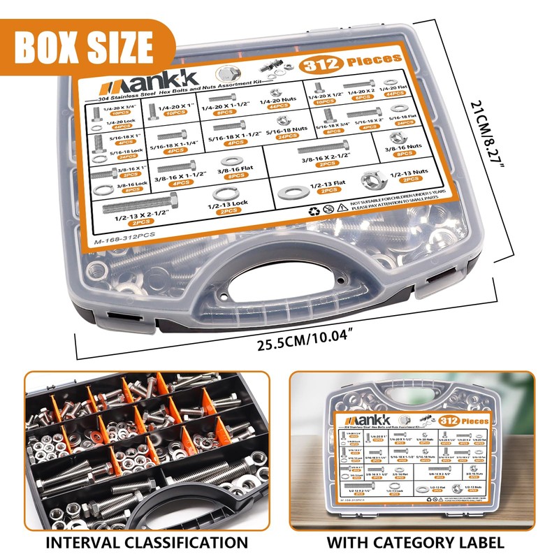 mankk 312PCS Hex Bolts and Nuts Assortment Kit,4 Sizes (1/4-20,5/16-18,3/8-16,1/2-13") 304 Stainless Steel Hex Bolts and Nuts Washers Kit Hardware Screws Set Flat & Spring Lock Washers
