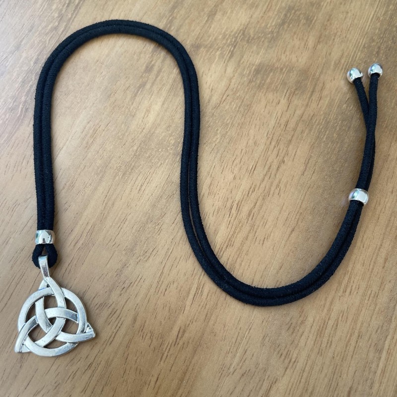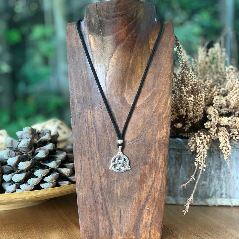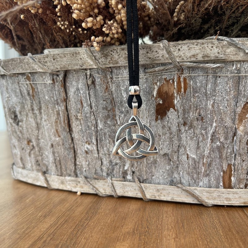 ⭐ BESCHREIBUNG: Schöne Halskette mit einem Anhänger in Form eines dreieckigen keltischen Knotens aus antikem Silber und 3 mm dickem schwarzem Wildleder. Abmessungen des Anhängers 35x27 mm. Die Halskette hat eine Länge von 35 cm und ist verstellbar.