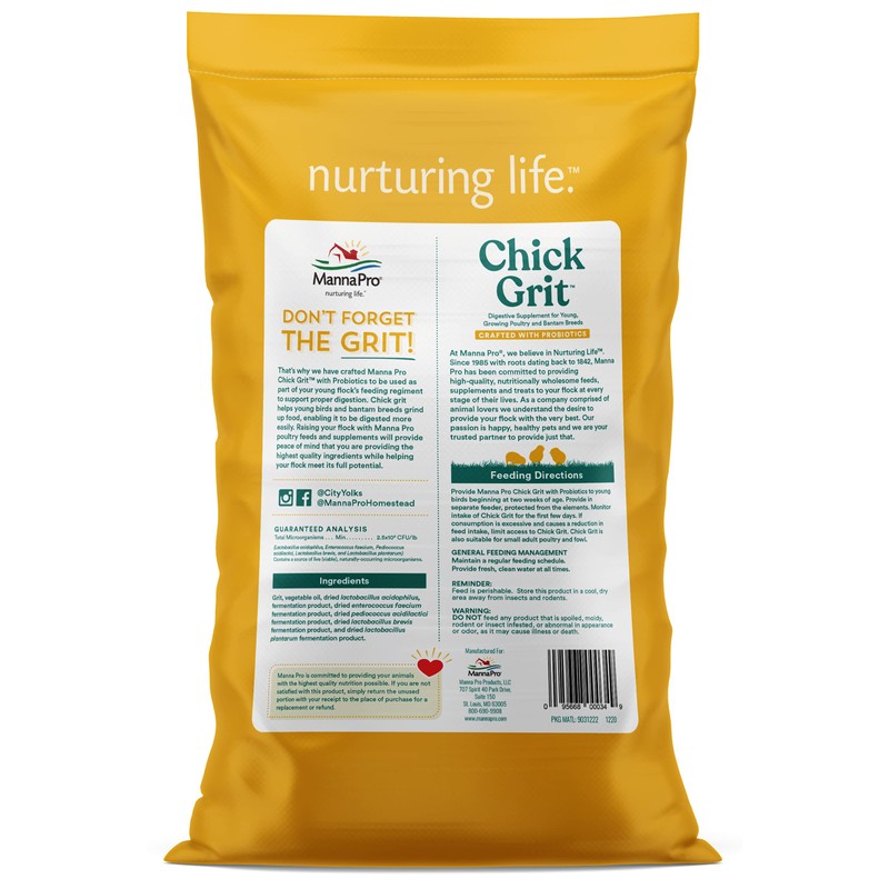At Manna Pro we believe in Nurturing Life. Since 1985 with roots dating back to 1842, Manna Pro has been committed to providing high-quality, nutritionally wholesome feeds, supplements and treats to your flock at every stage of their lives. As a company comprised of animal lovers we understand the desire to provide your flock with the very best. Our passion is happy, healthy pets and we are your trusted partner to provide just that. That’s why we have crafted Manna Pro Chick Grit with Probiotics to be used as part of your young flock’s feeding regiment to support proper digestion. Chick grit helps young birds and bantam breeds grind up food, enabling it to be digested more easily. Raising your flock with Manna Pro poultry feeds and supplements will provide peace of mind that you are providing the highest quality ingredients while helping your flock meet its full potential.