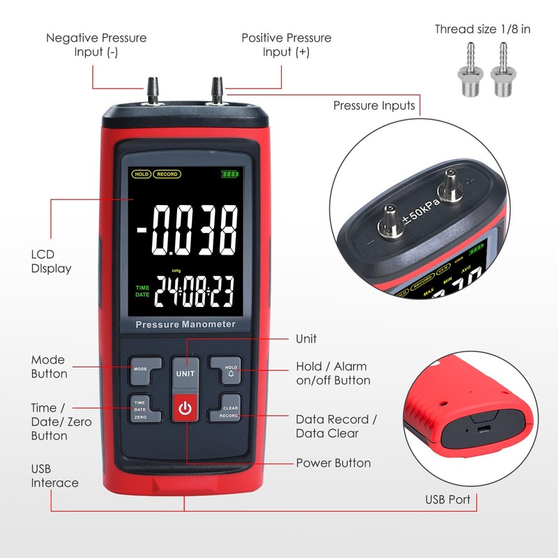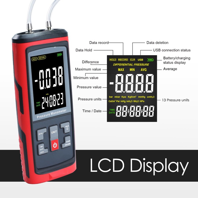 - 【Versatile Tool】LANDTEK Differential Pressure Gauge can measure the air pressure of the single pipe,or differentiaal pressure of two pipes. USB rechargeable,Data Record, High/ Low Alarms,Data Hold, MAX/MIN/Average, Large LCD with backlit.It is a great tool for any professional or amateur in the air pressure measuring industry