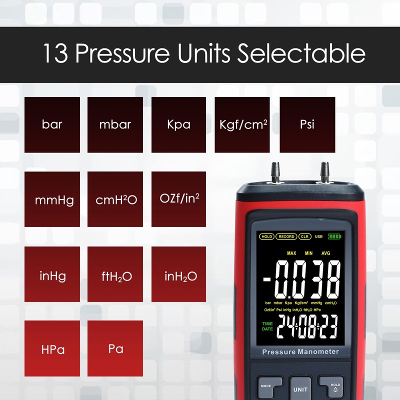 - 【13 Selectable Pressure Units Available】This Digital manometer HVAC features with 13 units selections for gas/air pressure measurement, including mbar, Kpa, Kgf / cm2, mmHg, cmH2O, Ozf / in2 , Psi, inHg, inH2O, ftH2O, HPa and Pa