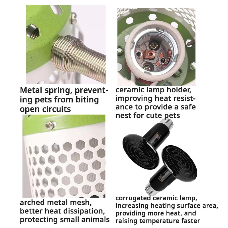- Durable and Safe: With a high-temperature protector and sturdy ceramic material, this lamp is built to withstand prolonged use without warping or peeling off paint. The metal spring design prevents pets from tampering with the electrical circuits, while the curved metal grid facilitates better heat distribution and safeguards small animals from direct contact with the lamp