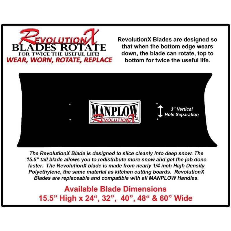 This blade is over 728 square inches and not even our biggest blade. At 15.5” tall, this is a serious piece of equipment and it may take a few snowfalls to figure out how it can work best on your property. Originally designed for maintaining ice on outdoor hockey rinks in between games, Super Wide's have been put into service by contractors and residential users alike. Ideal for folks that can attack large snow fall early and often! NOT made for heavy snow falls. Best for 1-4 inches only. Store VERTICALLY. Blade may buckle if stored horizontally during the off season. All MANPLOW U Handles are pre-drilled for the MANPLOW Grab Bar. Recommended for this model. RevolutionX Blades are 15.5” tall and designed so that when the bottom edge wears down. The blade can rotate, top to bottom for twice the useful life. MANPLOW’s have the reputation for being extremely long lasting and durable AND now they will last TWICE as long! The RevolutionX Blade is designed to slice cleanly into deep snow. Its tall blade allows you to redistribute more snow and get the job done faster. The RevolutionX blade is made from nearly 1/4 inch High Density Polyethylene, the same material as kitchen cutting boards. RevolutionX Blades are replaceable.