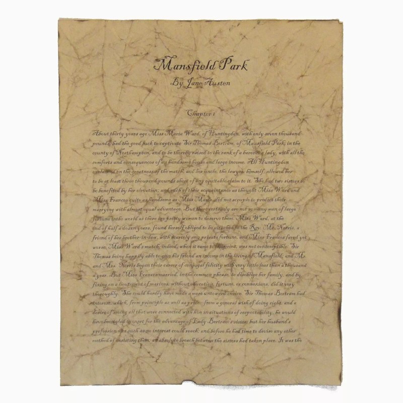 Mansfield Park can now be remembered and cherished with this antiqued copy of the first page of Jane Austen's classic novel. Whether framed on a wall or used as part of a centerpiece, this beautifully aged paper will be loved by any Mansfield Park or Jane Austen fan. Our four step aging process transforms regular paper into paper that looks hundreds of years old. It not only LOOKS antique, but it FEELS antique, as well!