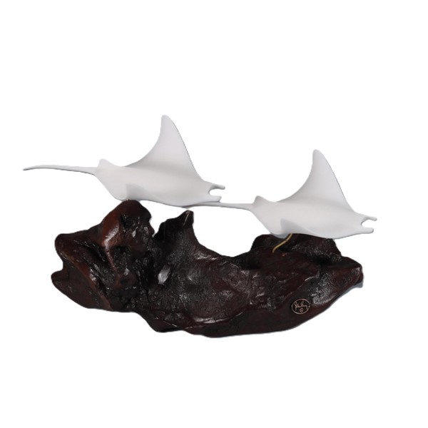 Manta Ray Duo Sculpture by John Perry White Statue on Wood 8in Tall by John Perry Studio