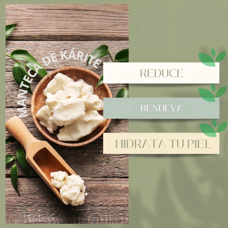 La pureza de nuestra manteca de karité asegura que es hipoalergénica, perfecta para todo tipo de pieles, incluso las más sensibles. Su función principal es nutrir intensamente, gracias a su rica composición en ácidos grasos esenciales y vitaminas A, E y F, conocidas por sus propiedades reparadoras y protectoras. El envase de tarro facilita la aplicación y mantiene el producto en óptimas condiciones hasta su vencimiento.