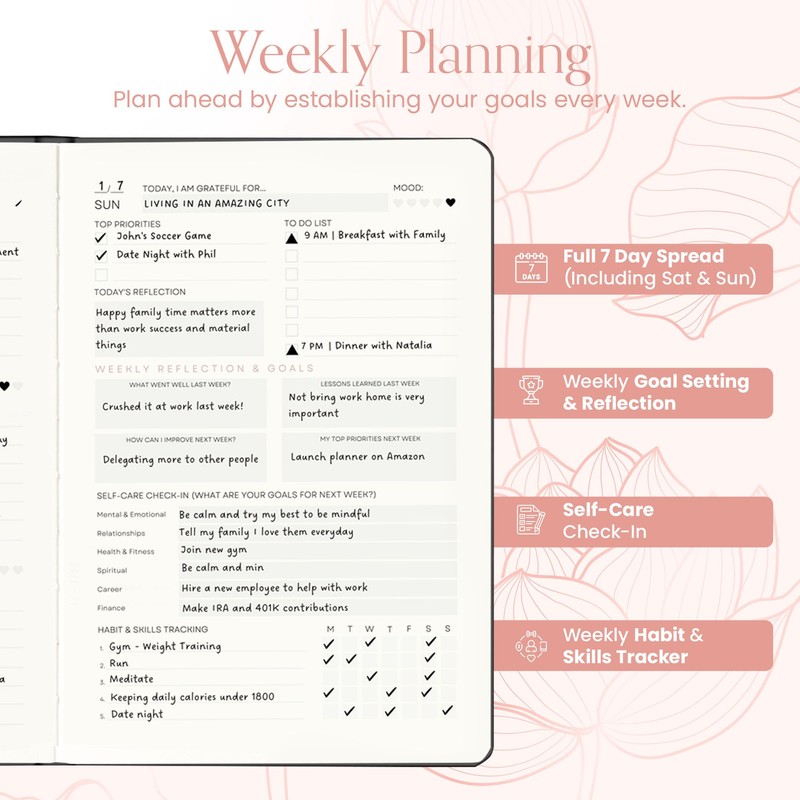 • ✅ 2024 Self Care Weekly Planner: Plan each week and reflect on each week’s performance. Use the weekly self-care planner section to make time for mental and emotional well-being, track and develop healthy habits, and ensure a balanced approach to your personal and professional goals.