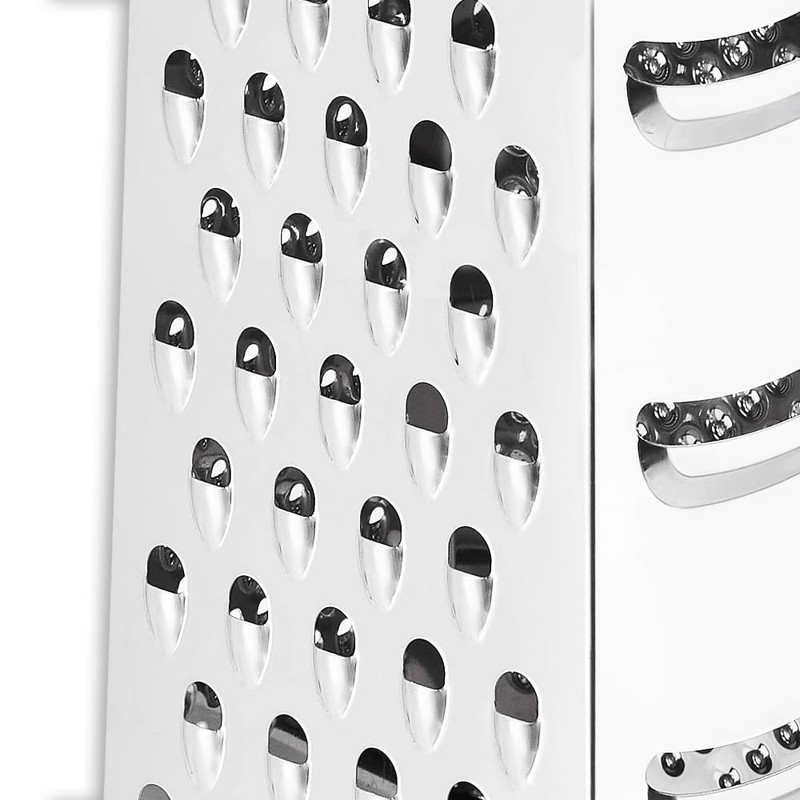 - The stainless steel from which this grater is made allows for a long service life without any kind of damage, while at its bottom the edges are rubberised to allow our tool to be deposited without the risk of contaminating the sheet with other influences
