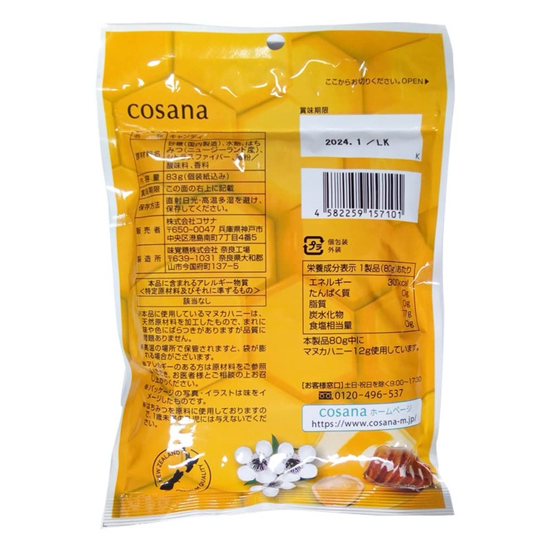 - Ingredients: Sugar (made in Japan), sugar syrup, honey (from New Zealand), citrus fiber, starch / acidulant, flavoring