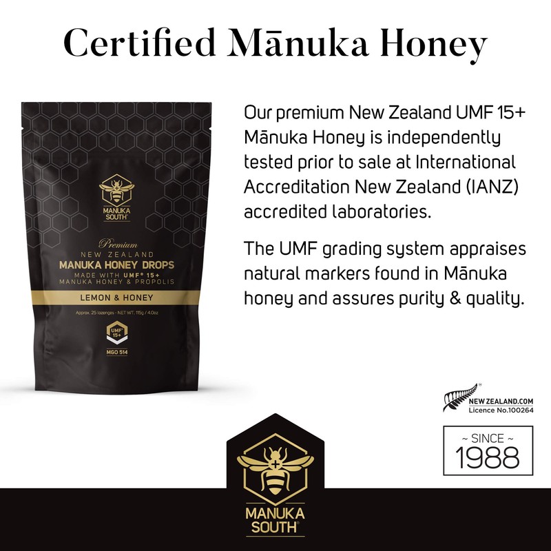 - LEMON & MANUKA HONEY DROPS: Manuka South’s premium Lemon & Manuka Honey drops feature high strength Non GMO UMF 15+ (MGO 514) Manuka honey and premium New Zealand sourced Propolis Extract. With added natural Lemon flavor, Echinacea, Eucalyptus oil & Menthol crystals. Each pack contains approximately 25 drops.