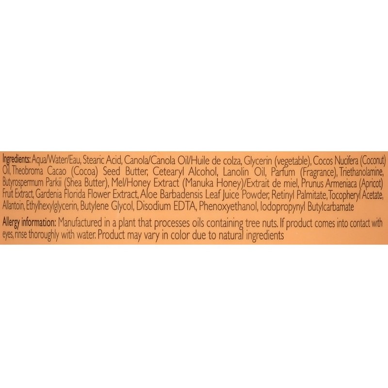 Aqua/Water/Eau, Stearic Acid, Canola/Canola Oil/Huile de colza, Glycerin (vegetable), Cocos Nucifera (Coconut) Oil, Theobroma Cacao (Cocoa) Seed Butter, Cetearyl Alcohol, Lanolin Oil, Parfum (Fragrance), Triethanolamine, Butyrospermum Parkii (Shea Butter), Mel/Honey Extract (Manuka Honey)/Extrait de miel, Prunus Armeniaca (Apricot) Fruit Extract, Gardenia Florida Flower Extract, Aloe Barbadensis Leaf Juice Powder, Retinyl Palmitate, Tocopheryl Acetate, Allantoin, Ethylhexylglycerin, Disodium EDTA, Phenoxyethanol
