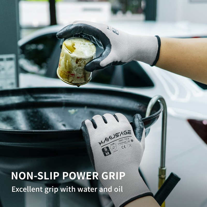 - SUPERIOR PERFORMANCE - MANUSAGE safety work gloves feature with soft stretchy and super dexterity, touchscreen capability to use smartphone anytime. Flexible elastic cuffs fully protect your wrist from dirt and debris.Excellent tactile sensitivity, easy to work with small and fine parts for good tactile sensitivity.The Smooth Nitrile coated gloves provide great dexterity and grip even in wet and oily conditions