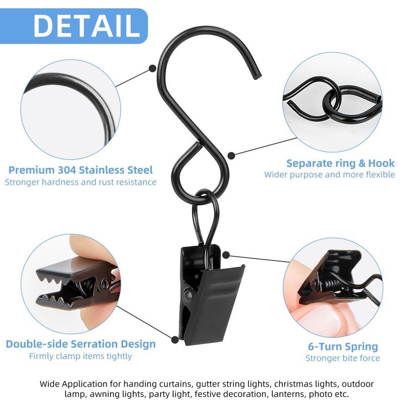 - Our S hook light clips made of premium 304 stainless steel and all will test and double check before shipment, stronger hardness and stronger rust resistance,offer more widely application and accompany you for longer period of time!