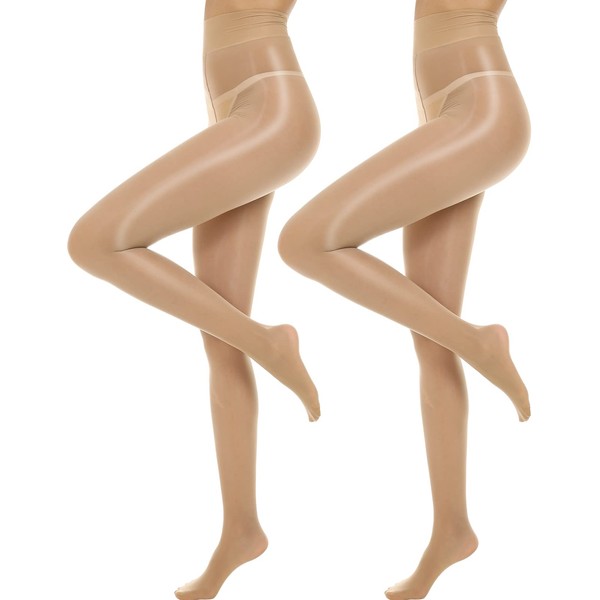 MANZI Shiny Pantyhose for Women 2 Pairs Shimmer Sheer Tights Ultra Silky Natural Small-Medium