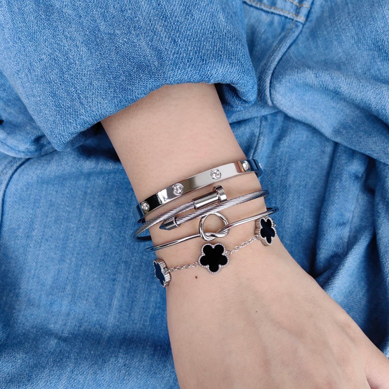 MAOCEN Womens 4Pcs Stackable Floral Gold Bracelets Stainless Steel Bangle Bracelets Non Tarnish Silver Set Trendy Jewelry Gifts for Womens (Silver Black, 7")
