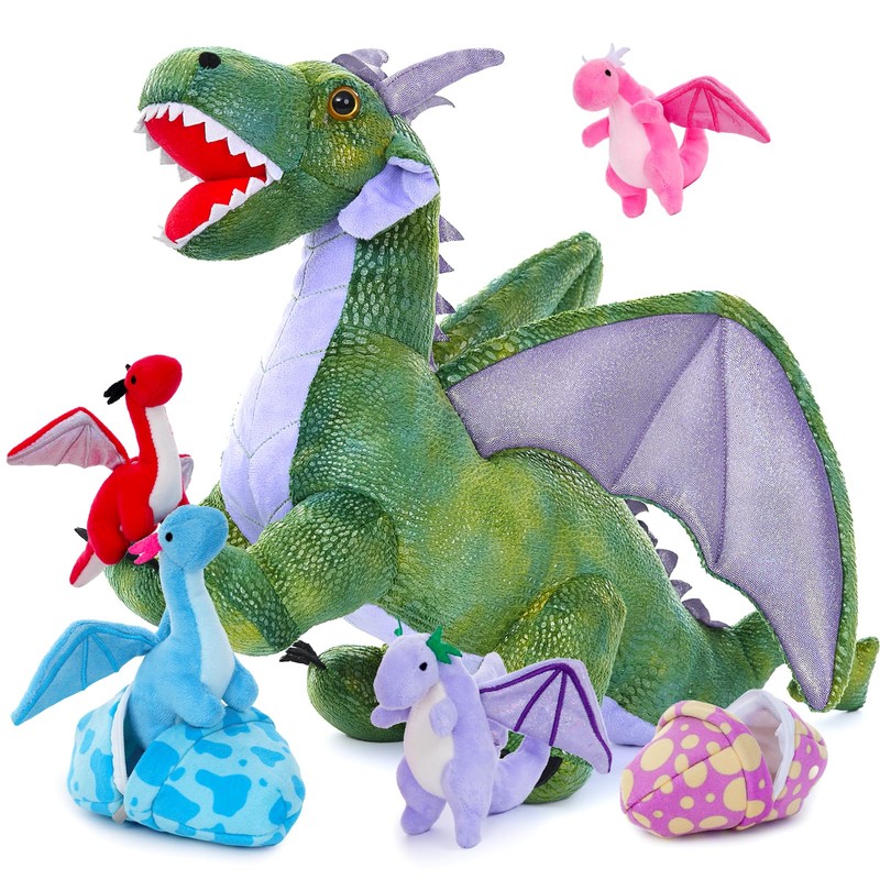- Green Dragon with Babies: 5 stuffed dragon toy and 2 eggs in one, you will get a big pregnant dragon Mom plush,4 cute dragon babies and 2 dragon eggs.Dragon stuffed animals bulk are pink,purple,red,blue,green. The mommy green dragon toy come with a surprise in her belly,open the zipper, you can get stuffies 4 small soft dragons toy and feel hatching