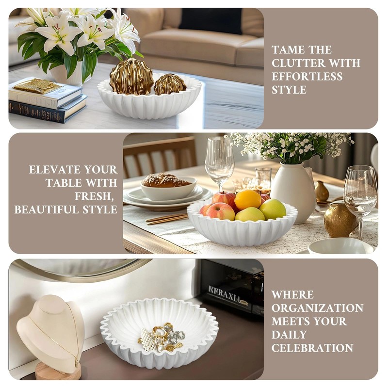 - CHIC BOWL: The designed in white fruit bowl wave shape perfectly fits the minimalist home style, retaining the practical function and injecting a unique artistic aesthetic into the space. Its ruffle bowl smooth curve and innovative groove structure breaks the single sense of traditional bowl shape, giving home decor more layers and dynamic vision.