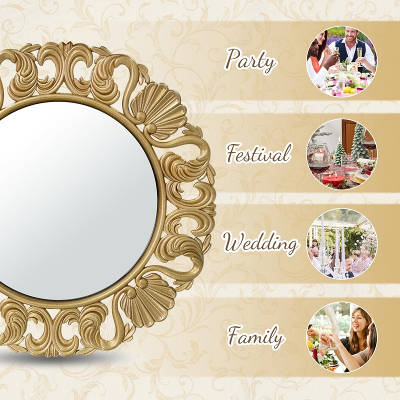 - HIGH QUALITY: Made from high-quality plastic and durable glass mirrored, our gold chargers is sturdy enough to withstand daily use, and its reflective surface will bring extra attention to your table display. Plastic charger plates is slightly elevated, adds height to your table setting and enhance the desktop landscape.