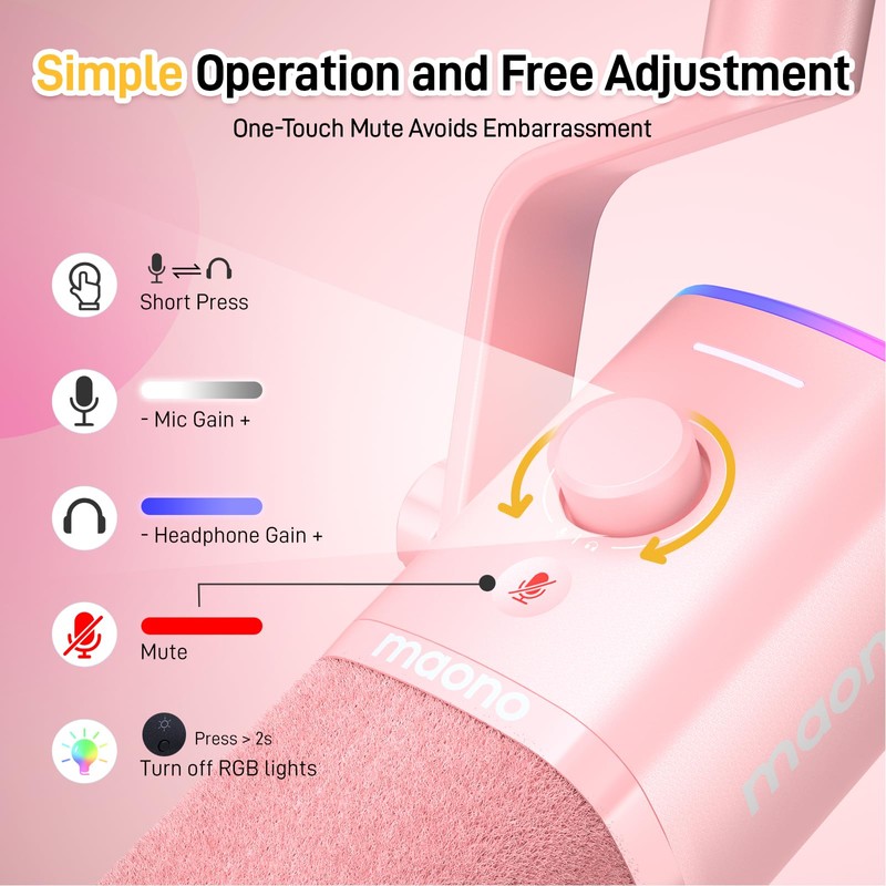 MAONO Dynamic Gaming Microphone with Software: USB XLR Podcast Computer Microphone with Boom arm - RGB PC Mic for Gamer - Podcast Mic for Streaming Recording Studio YouTube Online Chat-PD100XS Pink
