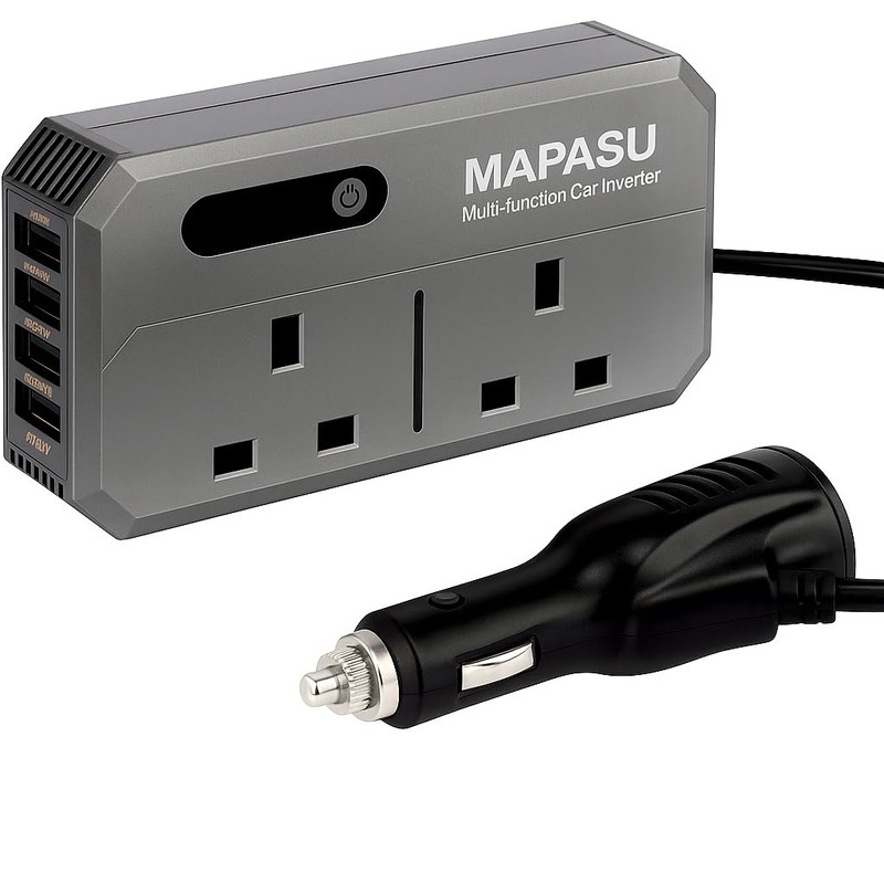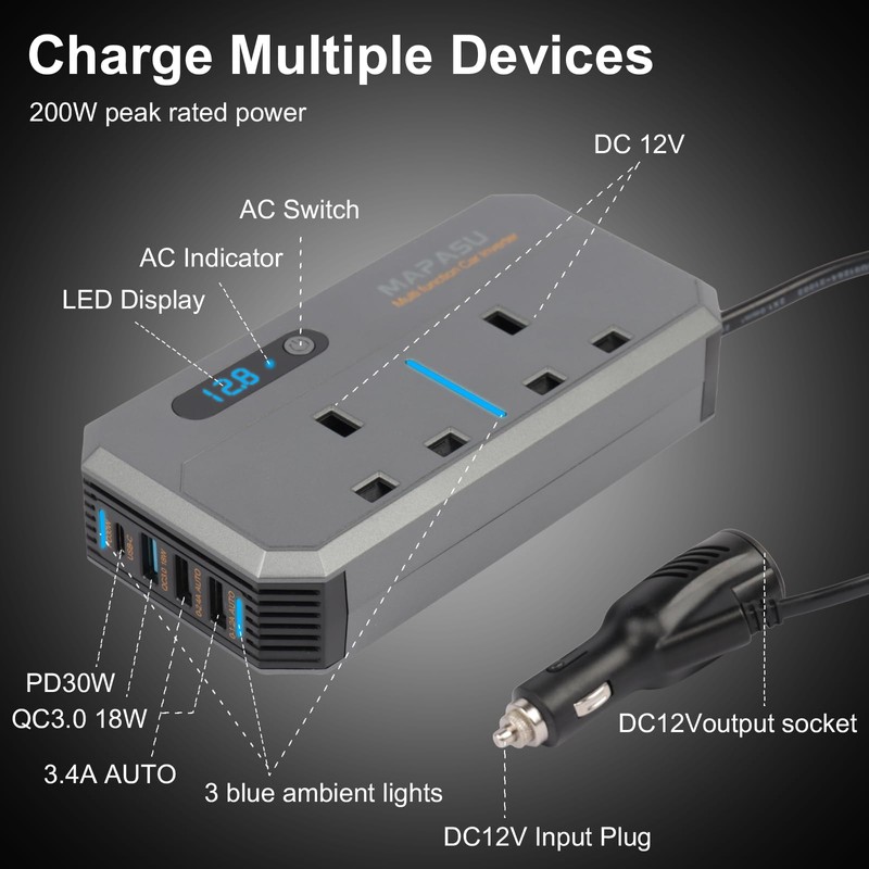 MAPASU 200W Car Power Inverter DC 12V to 220V AC | 2 AC Outlets, 3 USB Ports (6.2A Max), 30W PD USB-C, QC3.0 Fast Charging | Laptop, Phone & Device Charger for Car, Van, Camper, Travel
