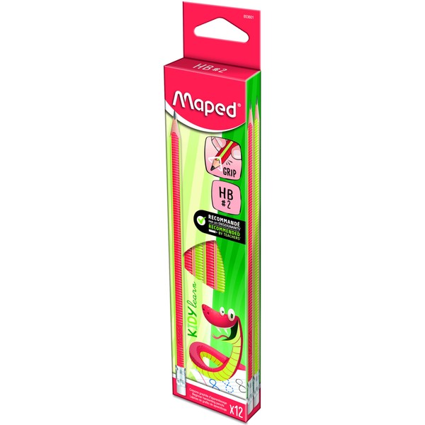 Maped - Box of 12 Graphite Pencils - HB Triangle - Kidy Learn - Eraser Tip - Non-Slip Texture