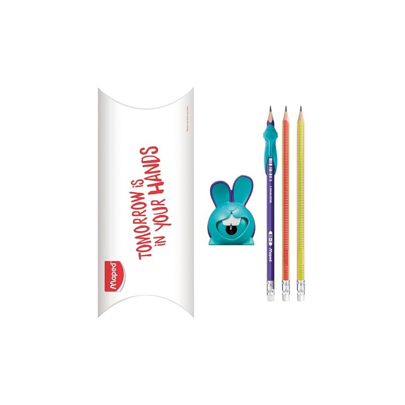 Maped - Learn to Write Set - Croc Croc Rabbit Pencil Sharpener + 1 Graphite Pencil with Shark Finger Guide + 2 Kidy Learn Pencils