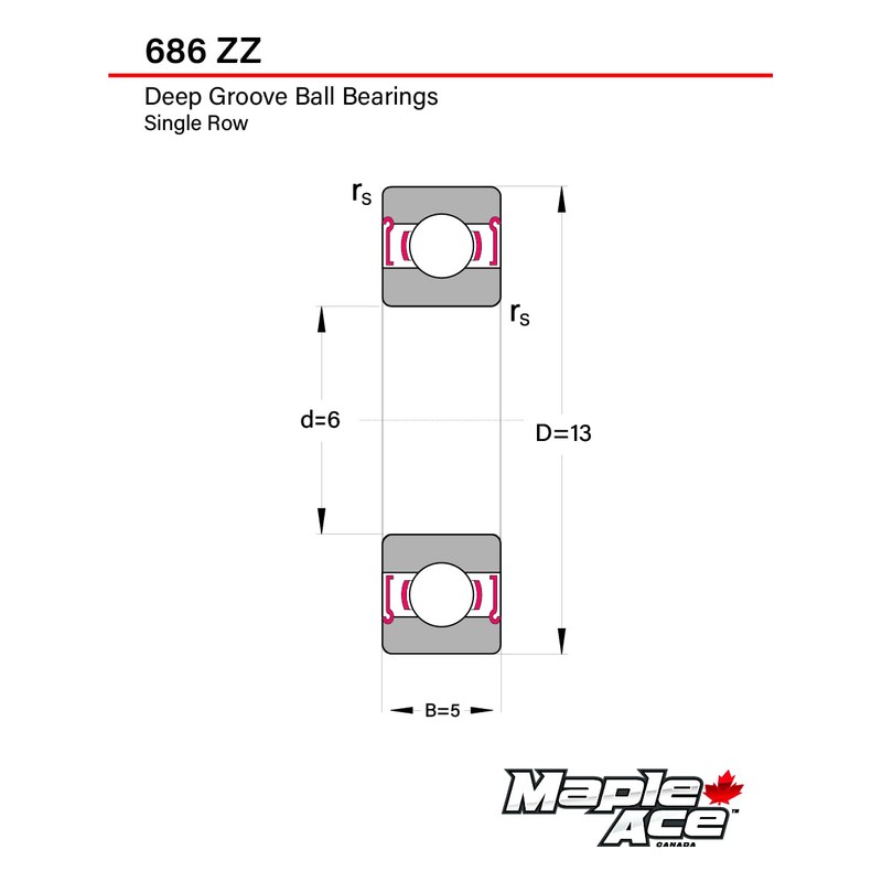 - 686 ZZ Deep Groove Ball Bearing dimensions: Bore Diameter 6mm, Outside Diameter 13mm, Width 5mm. It is made of 100% Chrome Steel and Pre-Lubricated with High-Quality Grease, ideal for use in High—and Low-temperature settings.