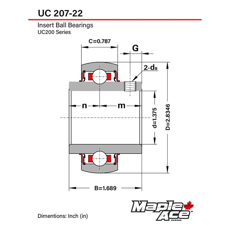 MAPLE ACE UC207-22 Insert Bearing 1-3/8" Bore, Spherical OD with Set Screws and Lubrication Hole