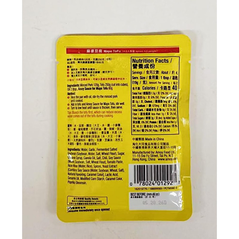 Transform your tofu into a mouthwatering Sichuan-style dish with this authentic Mapo Tofu sauce. Each 2.82 oz packet contains the perfect blend of savory and spicy seasonings to create the classic Chinese comfort food. This convenient pack of 4 sauce pouches makes it easy to prepare restaurant-quality Mapo Tofu at home - simply combine with soft tofu cubes and ground meat if desired. The rich, flavorful sauce features the signature numbing and spicy taste profile characteristic of traditional Mapo Tofu. The pre-mixed sauce eliminates the need to source multiple specialty ingredients while delivering consistent results every time. Each portion is individually packaged for optimal freshness and ease of use. Whether you're an experienced cook or new to Chinese cuisine, this sauce helps you create an authentic tasting dish with minimal effort.