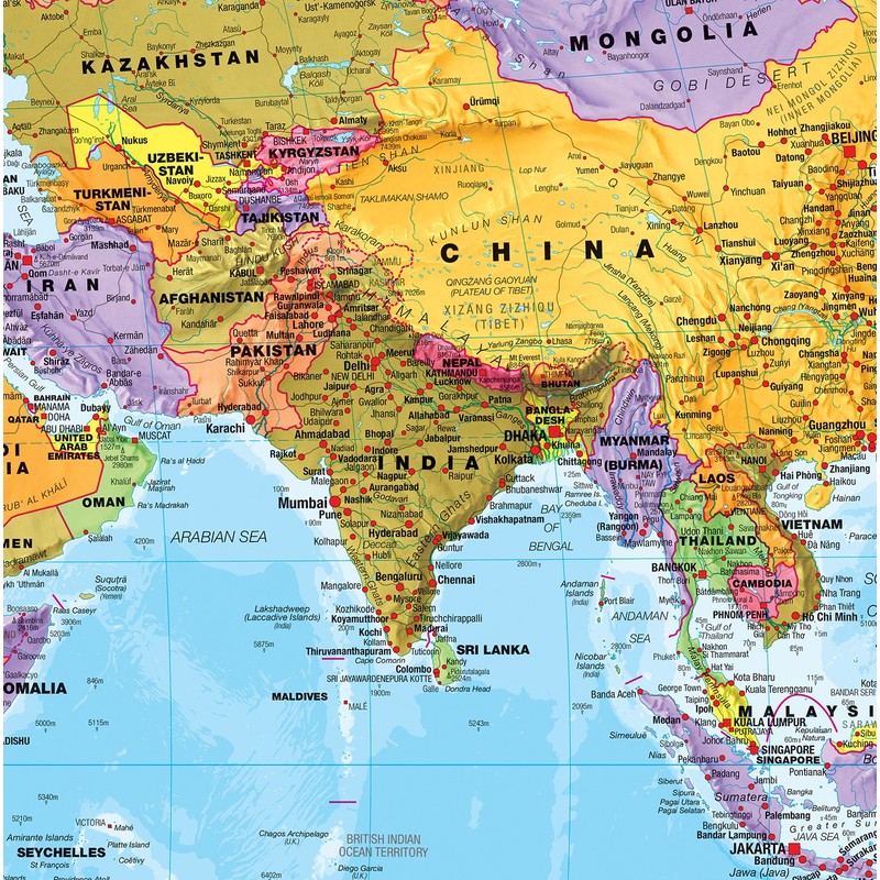 - STUNNING DETAIL: The political map of the world features colored countries, clear towns and cities, and the world map is finished with hill and sea shading.