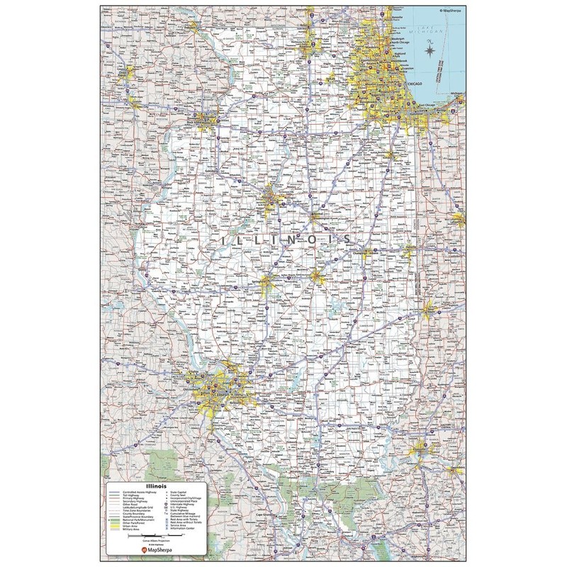 MapSherpa: Illinois State Wall Map - Compact - 16 x 24 inch Poster - Front Lamination