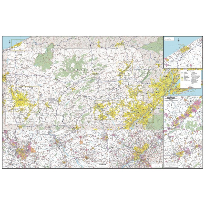 This detailed wall map of Pennsylvania is perfect for both educational and business purposes. The easy-to-read map features vibrant colors and clear labeling of cities, counties, highways, and geographical features. All national and state highways that connect the state are all clearly labelled on the map, while the legend notes the different road and land use classifications such as urban, park, military, and many more. The boundaries of each county in the state are defined and named clearly. Whether you are a student, teacher, business person or geography enthusiast, this map is a valuable addition to any space.