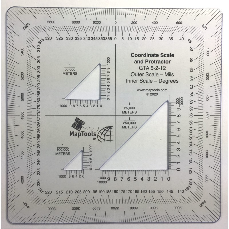 This tool is equivalent to the Graphic Training Aid 5-2-12 Coordinate Scale and Protractor used by United States and NATO military forces around the world. The scale has three die cut triangles for access to mark the map being measured. The inner protractor is marked in degrees and the outer protractor is in mils. (Size 5" x 5")