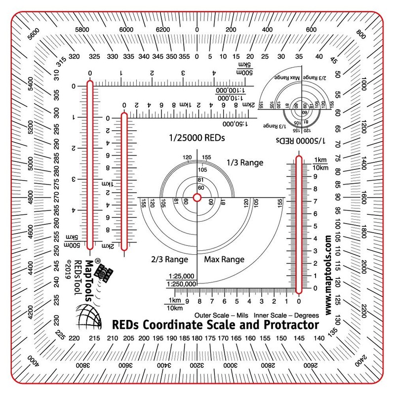 There are concentric range rings for standing posture REDs for 60mm, 81mm, 120mm mortars and 105mm and 155mm HE Howitzer rounds. There is a set of rings for 1:25,000 scale maps and another for 1:50,000 scale maps.