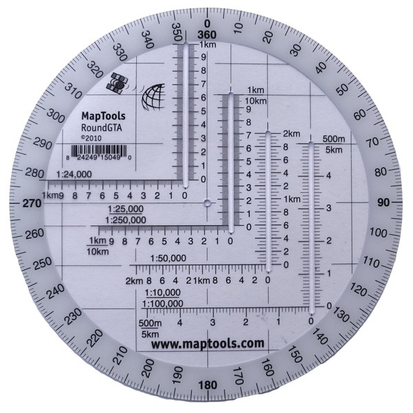 This tool is an improved version of the Graphic Training Aid 5-2-12 Coordinate Scale and Protractor used by United States and NATO military forces around the world. By using a slot on one side of the tool for access to the map, the tool can be more compact than the traditional GTA tool. The tool features several additional map scales, including 1:24,000, which is the most common topographic map scale found within the United States. The 1:100,000 scale now spans 5km grid lines, making it much more usable.