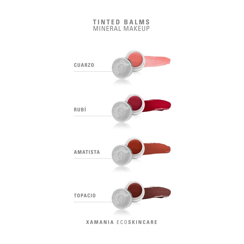 Los Tinted balms de Xamania están formulados con ingredientes 100% naturales como el aceite de argán y karité, son en crema y se pueden usar como rubor, bálsamo labial, sombra y contour. Su uso es 4x1 : 4 usos en 1 producto fácil de llevar en la bolsa y con un acabado delicado y 100% natural.