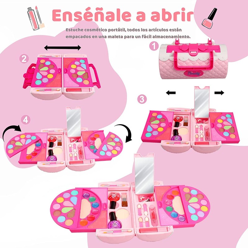 - 【Juguetes interactivos de integración para niñas】El juego de maquillaje es la mejor experiencia de juego de simulación para niñas. Los niños pueden maquillarse a sí mismos, a sus amigos, familiares o incluso a una muñeca, explorar las hermosas e infinitas posibilidades. Proporcione tiempo interactivo y de entretenimiento familiar para que la niña pueda fingir que se está maquillando como mamá y pintando esmalte de uñas.