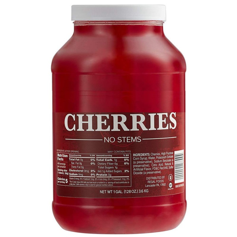 **Put the cherry on top of your signature desserts with these maraschino cherries without stems.** Featuring a vibrant red color, these maraschino cherries are sure to brighten up your menu items and bring something new to the table. The bulk gallon jar ensures that there's plenty for you to use to match the color scheme of your next holiday display or special event. **Orthodox Union Kosher** This item is certified Kosher by the Orthodox Union. **Easy to Use** With the stems already removed, these cherries come ready to use and help cut down on valuable preparation time. They're ready to add into baked goods, top off desserts, and add a cherry element to a fun cocktail. **Delicious Flavor** These cherries boast a crisp, sweet flavor and soft texture, making them a must-have topping for your restaurant, bar, ice cream shop, or bakery. **Resealable Container** To ensure optimum freshness, these cherries are picked at the peak of ripeness and packed in a hermetically sealed gallon container. **Versatile Ingredient** With their ruby red coloring and plump, juicy flesh, cherries are an excellent ingredient in a variety of desserts and cocktails. They're famous in pineapple upside down cakes, topping off any sundae, or garnishing a cocktail. With their juice, craft Shirley Temples or other cherry juice-based beverages. Create a compote out of these deliciously sweet cherries to add fillings to pastries or cakes, or add the cherries into milkshakes for an easy way to add a delicious dessert to the menu. Plus, the juice can act as a natural food coloring dye, giving a beautiful pink hue to cake batters, housemade ice cream, and even gourmet marshmallows.