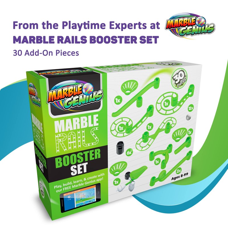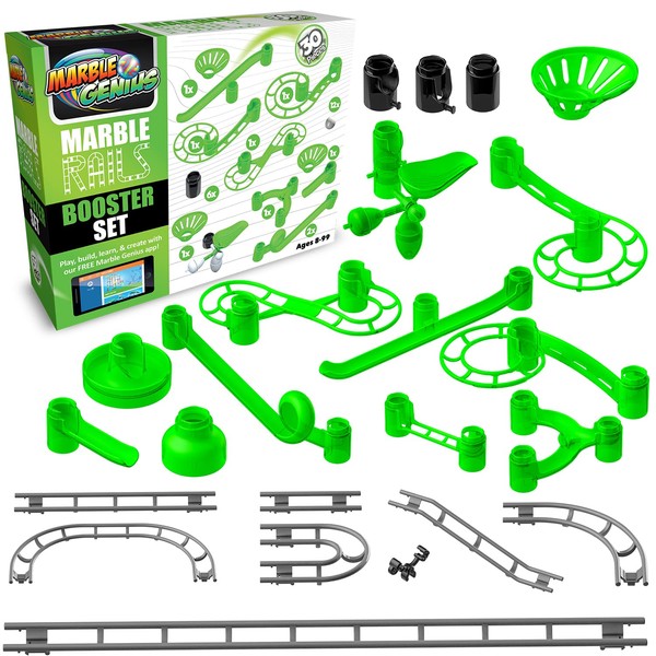 Marble Genius Add-on Accessory Marble Rails Booster Set, 30 Piece Marble Run for Kids 8+ (Action Rails, Jumps, Swings, Tubes & 12 Glass Marbles), STEM, Great for Kids & Teens