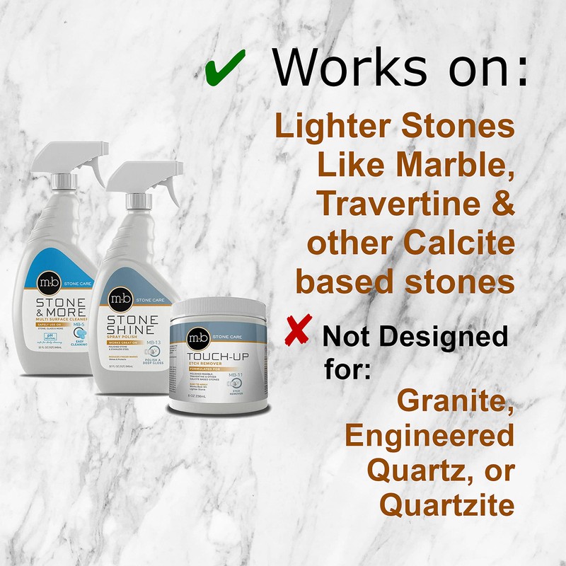 - ✅ MULTI PURPOSE STARTER PACK KIT - Includes 1 Quart / 32 FL OZ of MB-5 Stone & More Multi Surface Spray Cleaner, 1 Quart of MB-13 Stone Shine Spray Polish and 8 OZ MB-11 Touch Up Etch Remover.