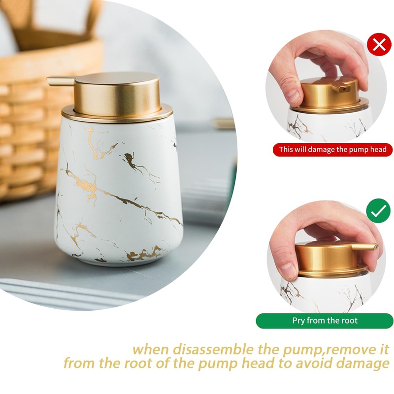 - Soap Dispenser Material- Marbled lotion liquid dispenser is made of ceramic,which can maintain lasting brightness,smooth.The golded pump of this hand soap dispenser is made of quality ABS material which will not rust,not fade.