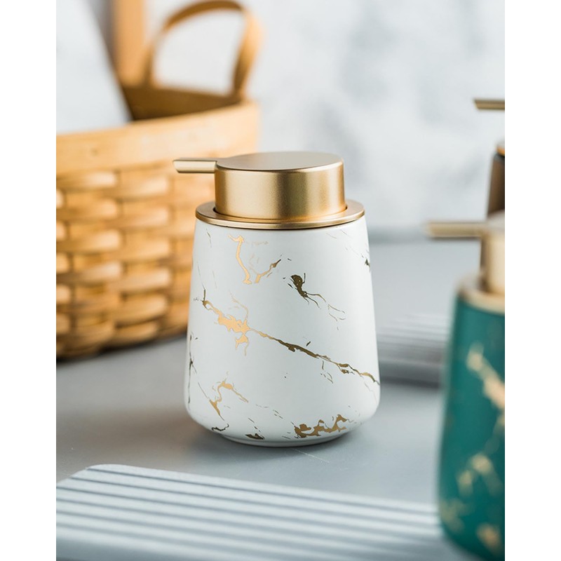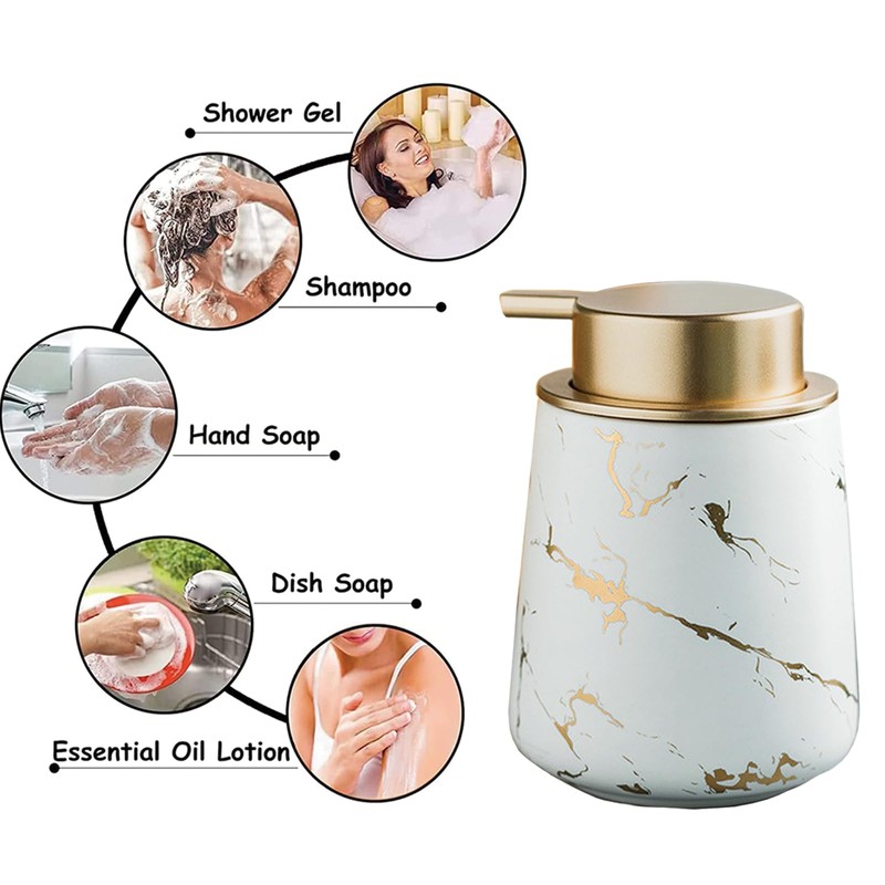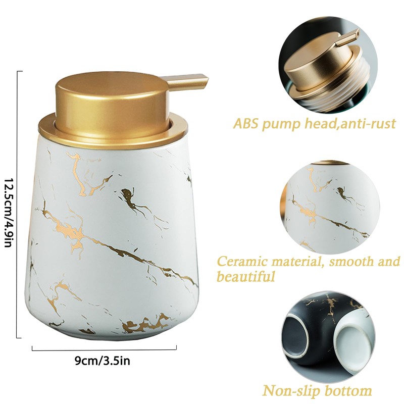 - Soap Dispenser Material- Marbled lotion liquid dispenser is made of ceramic,which can maintain lasting brightness,smooth.The golded pump of this hand soap dispenser is made of quality ABS material which will not rust,not fade.