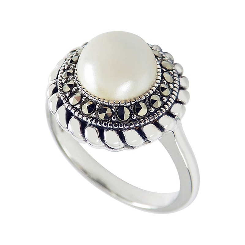 MARC 925 Sterling Silver 8 mm Faux Pearl & Marcasite Dome Ring