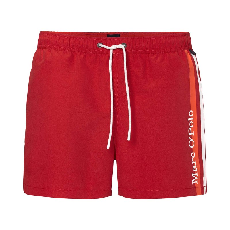 - Red swim shorts for men from the Marc O'Polo series Solids elastic waistband with drawstring and engraved logo metal cap closure Marc O'Polo motif print on the left leg with stripe detail two side and one back pocket. Inner briefs made of skin-friendly mesh and woven logo on the inner back