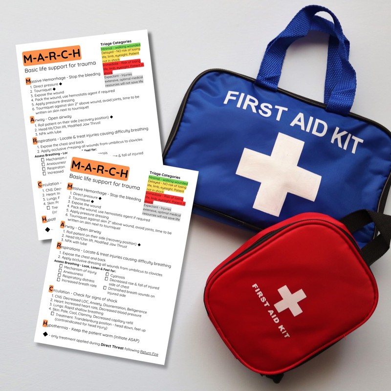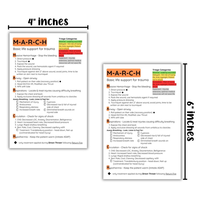 MARCH Basic Life Support for Trauma Checklist 10pk 4x6” Paper Reference Card Chart Casualty Management Injury Response Kit Survivor Training