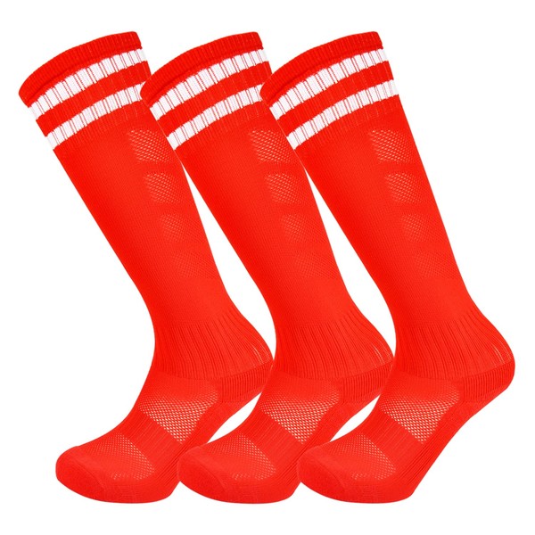 Marchare Boys Soccer Socks Toddler Athletic Socks 10-14 Years Knee High Striped Football Socks For Boys Girls Red 3 Pairs