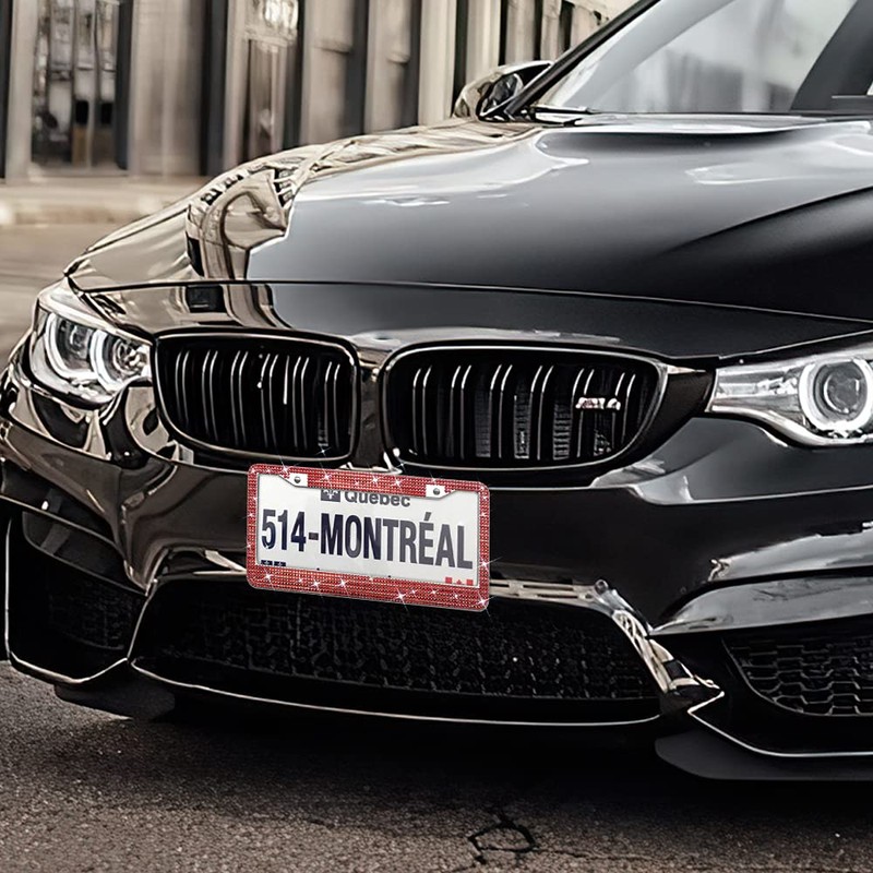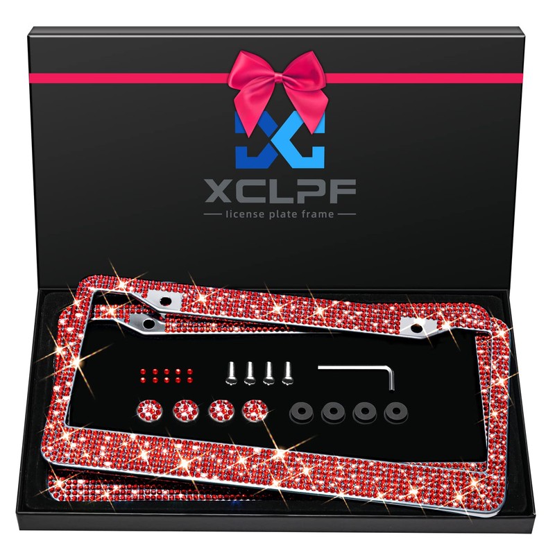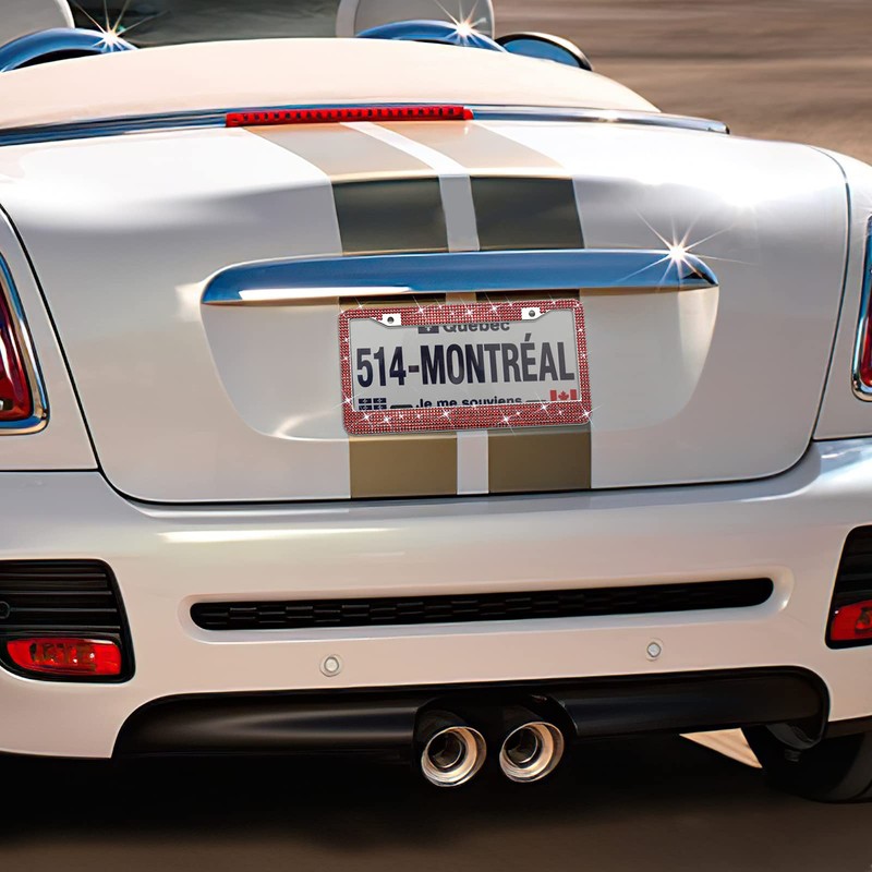 - Marco de matrícula con diamantes de imitación de vidrio brillante: marcos de acero inoxidable y más de 1000 cristales de diamantes de imitación de vidrio transparente de 14 facetas. El borde del marco brillante de la placa se ha rectificado para evitar arañazos en la pintura del coche. Este juego viene con diamantes de imitación AA SS16 y anillo de inicio automático.