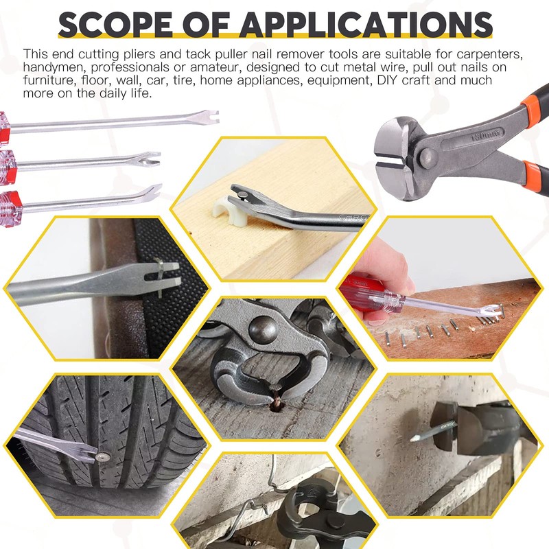 - ✅Offer Versatility ------- This end cutting pliers and tack puller nail remover tools are suitable for carpenters, handymen, professionals or amateur, designed to cut metal wire, pull out nails on furniture, floor, wall, car, tire, home appliances, equipment, DIY craft and much more on the daily life.