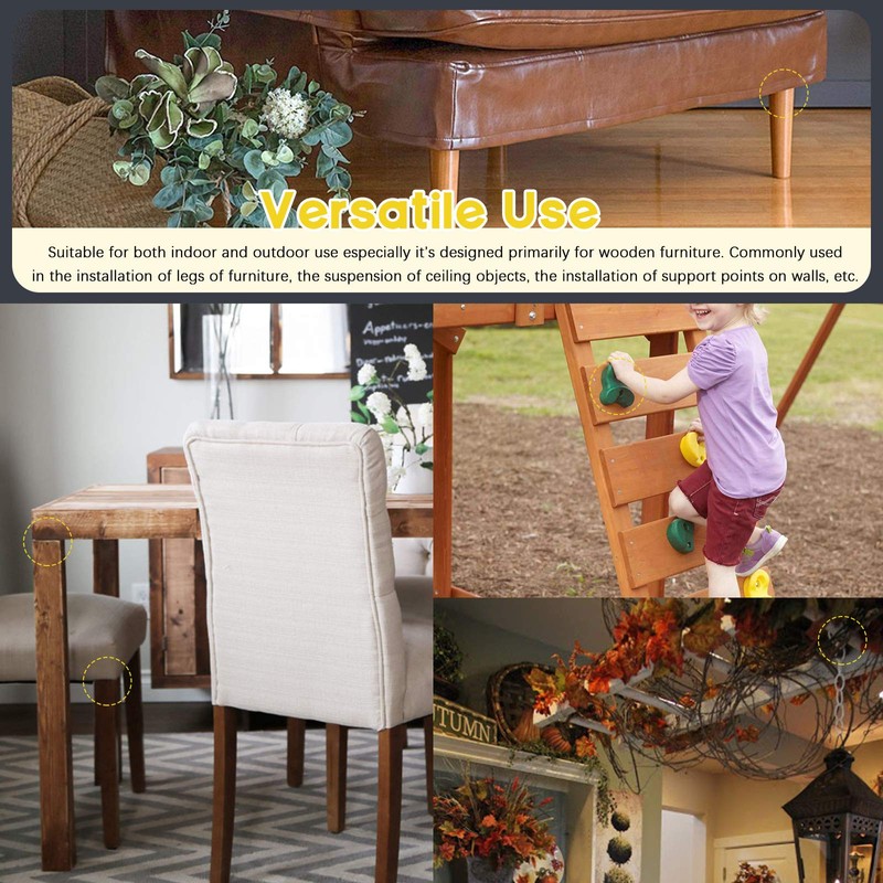 - PROVIDE STABILITY----- These t-nuts are more effective than wood screws to deal with the stress of constant movement. Its round base has 3 mounting holes to allow screws to hold it in place, meanwhile its threaded inserts is for joining corresponding parts, won't strip and cause cracks easily.