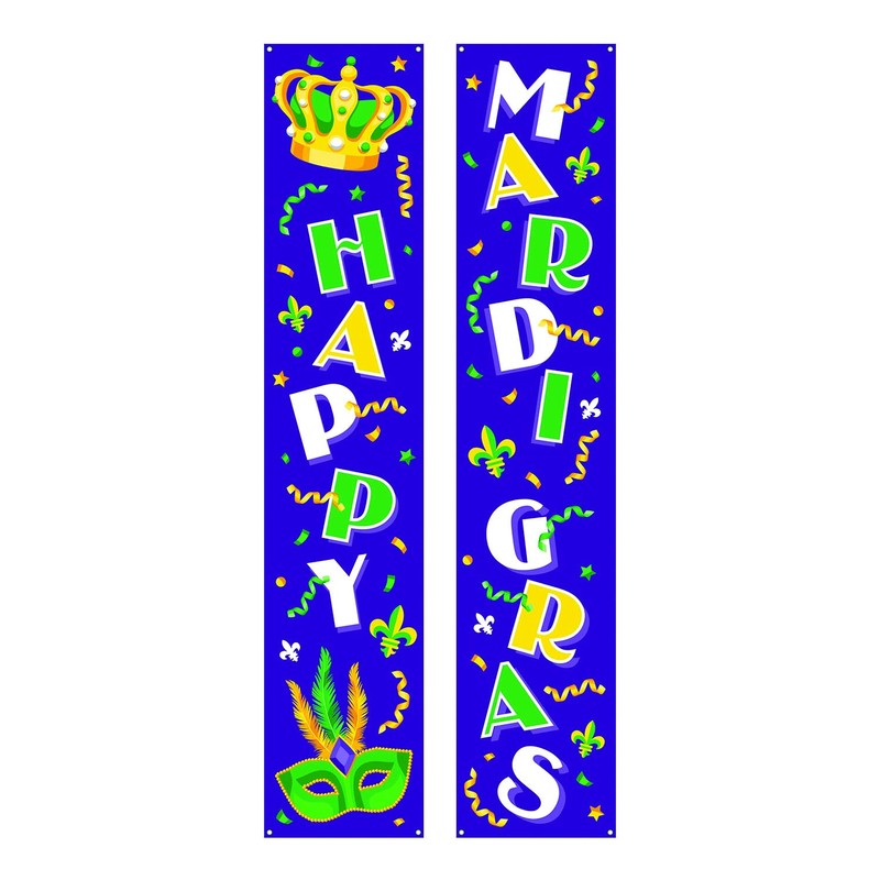 - This set of vertical banners feature the message “Happy Mardi Gras” along with Mardi Gras images and the classic colors of purple, yellow and green.
